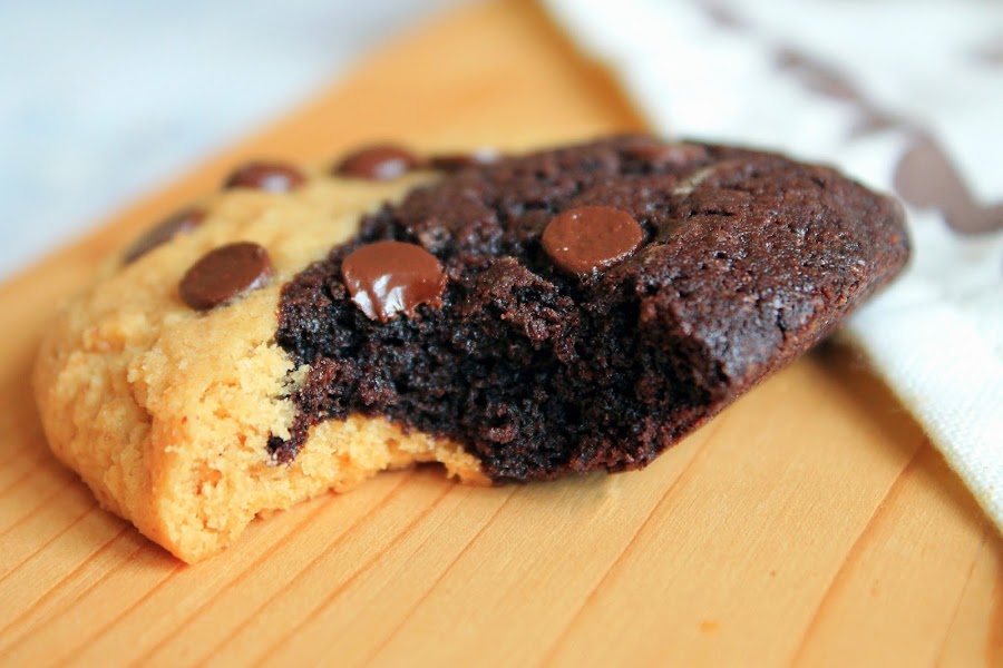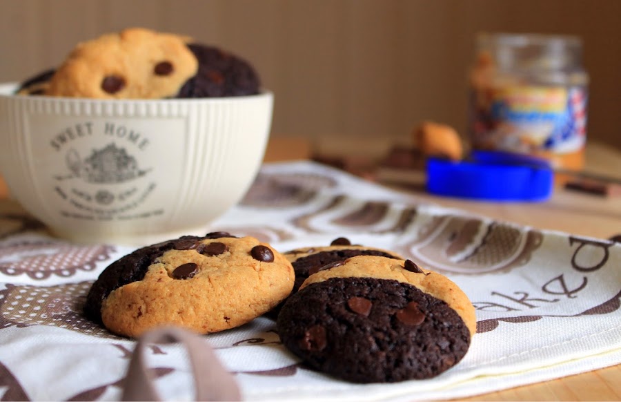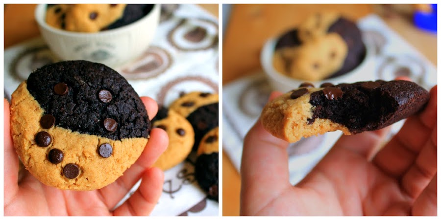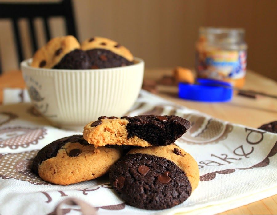 Pero cuando vi estas galletas en pinterest supe que tenía que hacer el esfuerzo de hacerlas. Mantequilla de cacahuete y chocolate, una mezcla que me encanta!! Y además con solo verlas supe que tenían esa textura que me encanta, crujientitas por fuera y un poco abizcochadas cuando las muerdes. Y además quedan monísimas con sus dos colores.