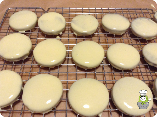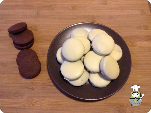 Una vez frías, vamos a preparar la cobertura. Fundimos el chocolate en un cazo al baño maría y bañamos las galletas con cuidado y con la ayuda de un tenedor las vamos sacando a una rejilla donde esperaremos a que el chocolate se solidifique.