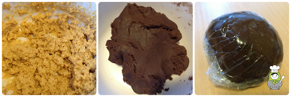 Por último vamos añadiendo los ingredientes secos a esta masa. Al principio podemos usar la batidora pero al final será necesario que nos ensuciemos las manos porque la masa resultante será bastante contundente aunque ni grasa ni pegajosa. Cuando tengamos los ingredientes bien amalgamados, tomamos una bola y la envolvemos con papel film y la dejamos reposar durante una hora en la nevera (Este paso solo es necesario si usamos la mantequilla reblandecida, si la usamos directamente de la nevera podemos trabajar la masa inmediatamente y hornear las galletas). Pasado este tiempo la sacamos y dejamos unos 10 minutos hasta que esté prácticamente a temperatura ambiente.