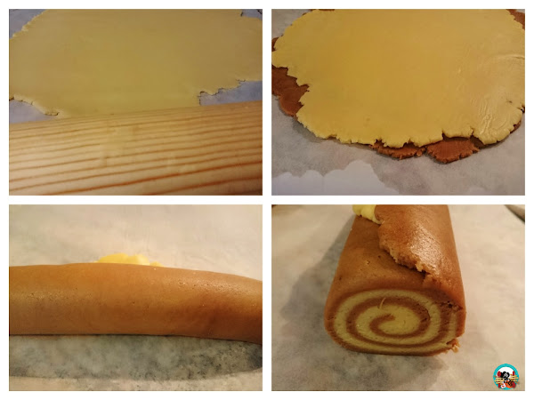 Extendemos la masa las con un rodillo, primero una y luego la siguiente. Como muestran las fotografías, ponemos una masa sobre la otra y formamos un rollo con ellas. Dejamos reposar 20 minutos en la nevera. Cortamos el rollo haciendo un corte firme de un centímetro hasta terminar con el rollo.