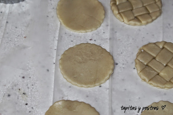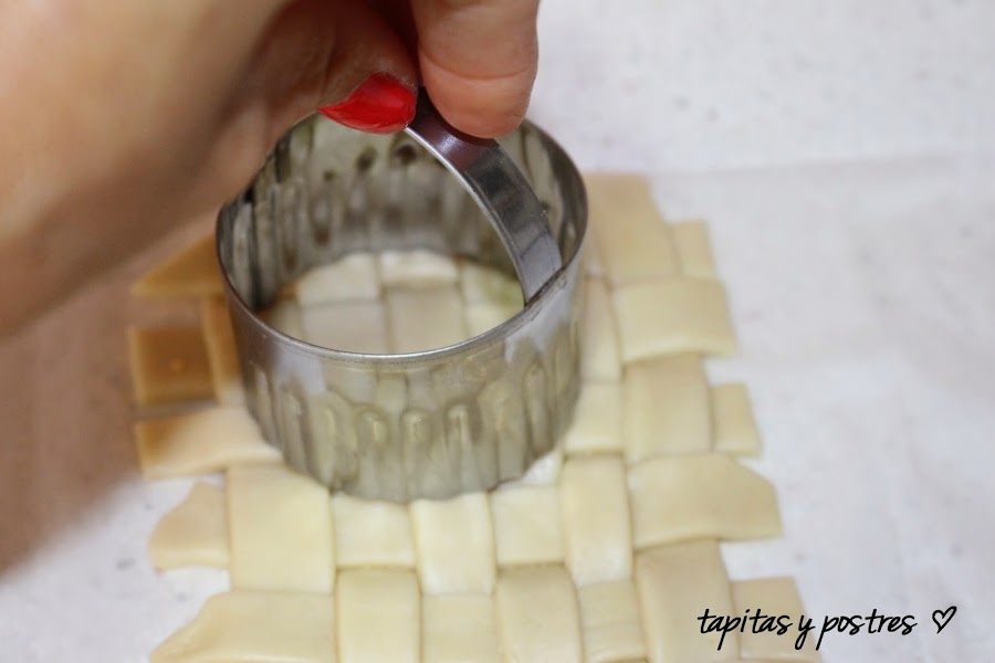 Ahora con un cortapasta redondo o un vaso pequeño, cortamos círculos del enrejado.