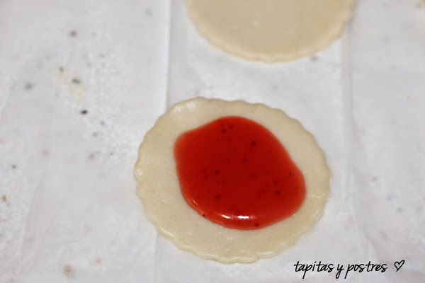 De la parte de la masa quebrada lisa cortamos círculos. Ponemos una cucharadita de mermelada de fresa.