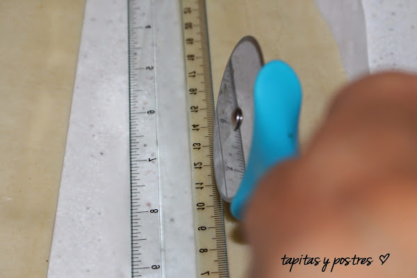 Cortáis tiras de un centímetro mas o menos. Yo usé una regla para que me salieran derechitas. Debéis cortar unas diez tiras, si necesitamos más se cortan después. Así dejamos una parte de la masa sin cortar para luego hacer las bases lisas de la galleta.