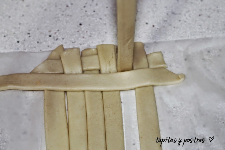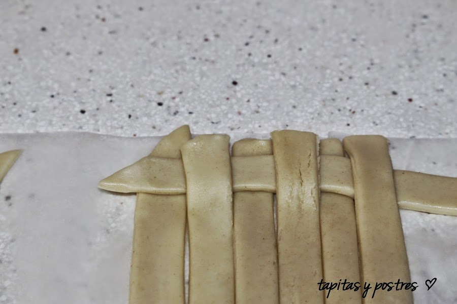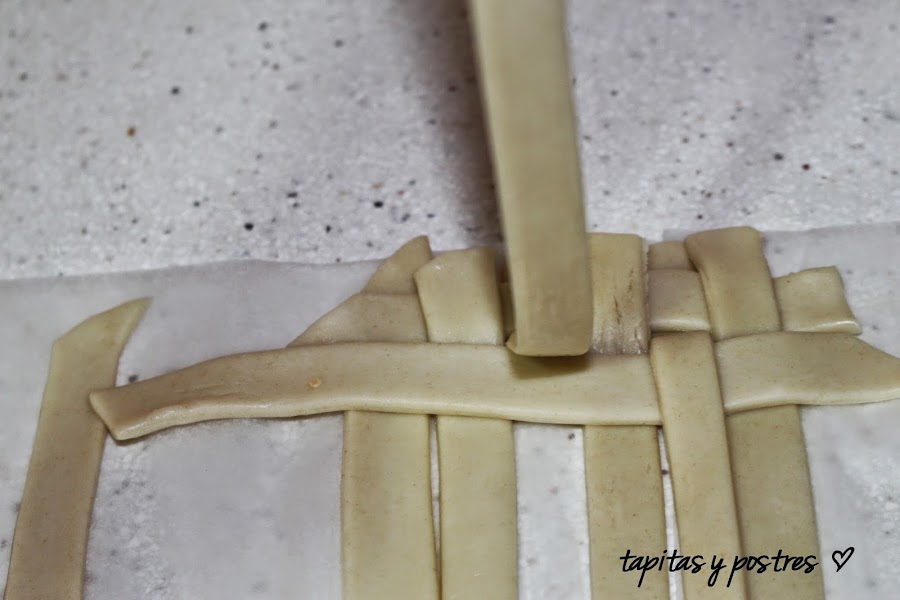 Ahora viene el enrejado. A ver si me explico bien. Ponéis cinco o seis tiras en forma vertical sobre un papel de horno. Cogéis una tira y la entrelazamos de forma horizontal.