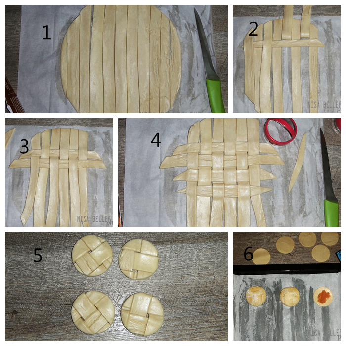 Colocamos estas últimas sobre la bandeja de horno forrada con papel de hornear y ponemos, en cada una, una cucharada de mermelada. Colocamos los enrejados que hemos reservado antes encima y apretamos un poco por los lados para que se pegue con la base y no se salga la mermelada.