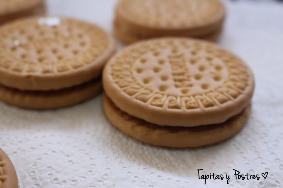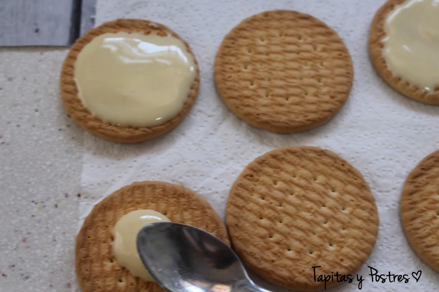 Untamos una galleta con una cucharadita de leche condensada y tapamos con otra galleta formando sándwiches.