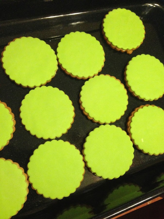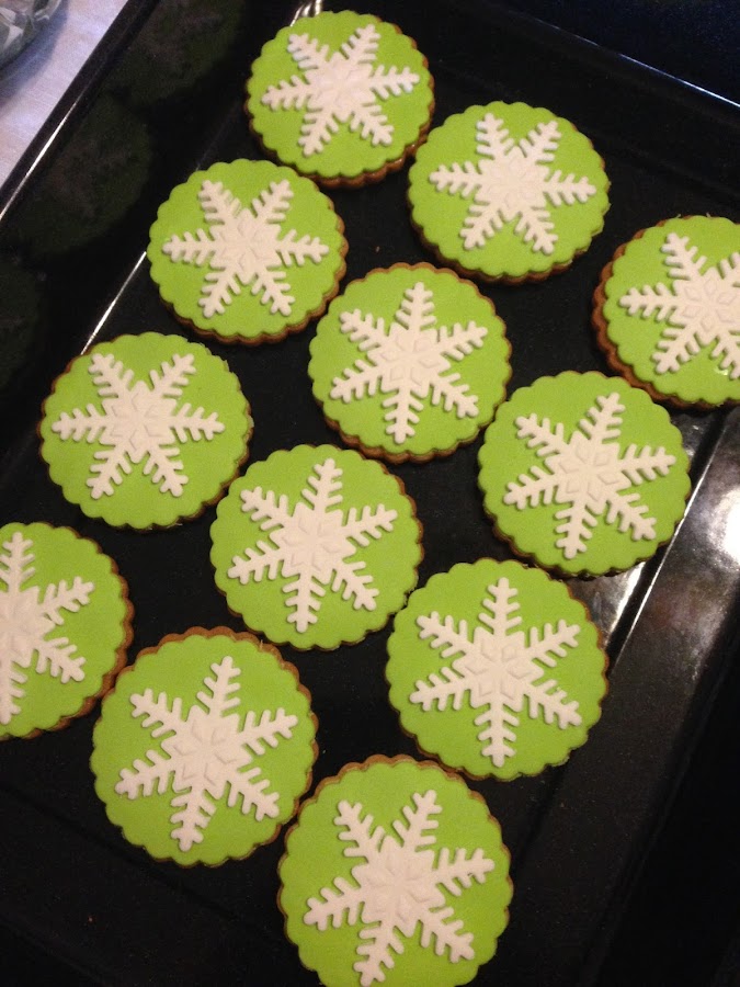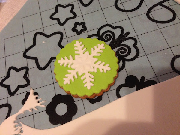 Mientras secan los copos pegamos el fondant verde a todas nuestras galletas