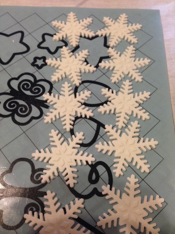 Con un cortador texturizador de copo de nieve hacemos los copos y los reservamos para que se vayan secando y no se nos deformen luego al cogerlos para pegarlos en la galleta
