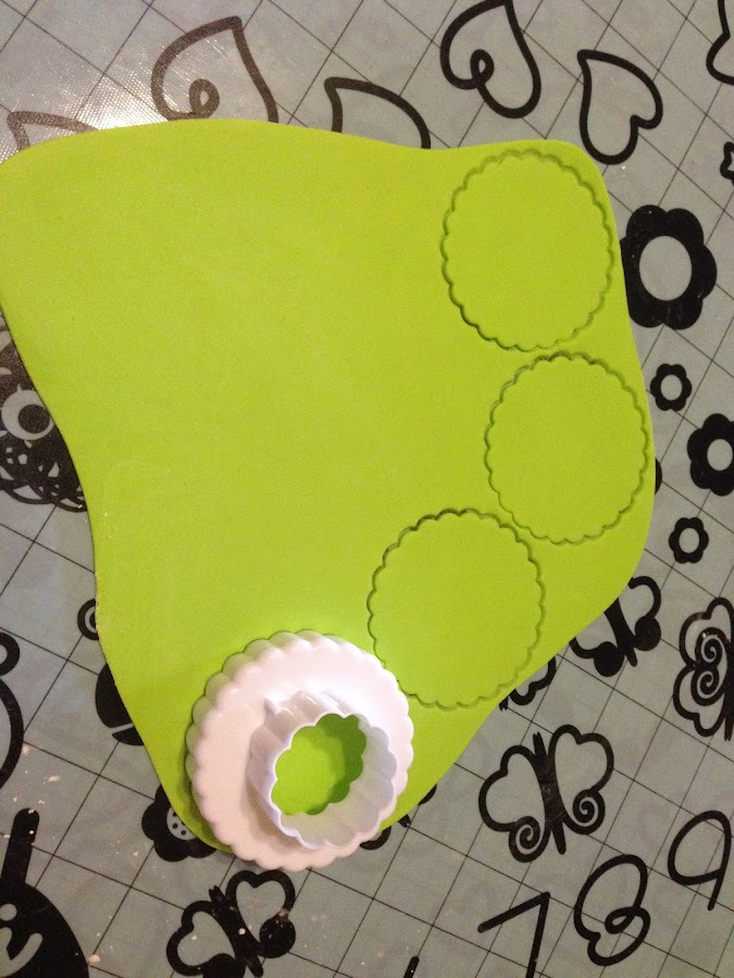 Estiramos fondant verde muy finito y lo cortamos con el mismo cortador de las galletas