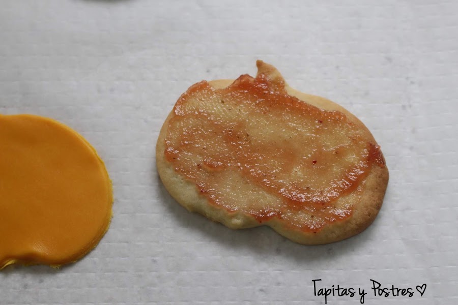 Con la galleta fria ponemos un poquito de mermelada o nocilla para pegar el fondant.
