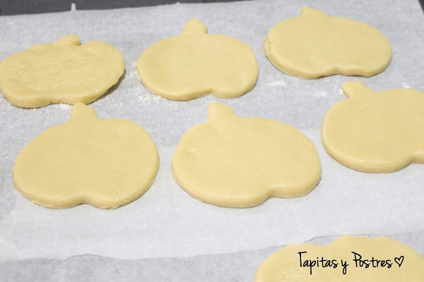 A la media hora, la sacamos y sobre la encimera enharinada y estiramos con el rodillo hasta tener por todos lados el mismo grosor, como medio centímetro. Con el cortapasta en forma de calabaza cortamos las galletas.