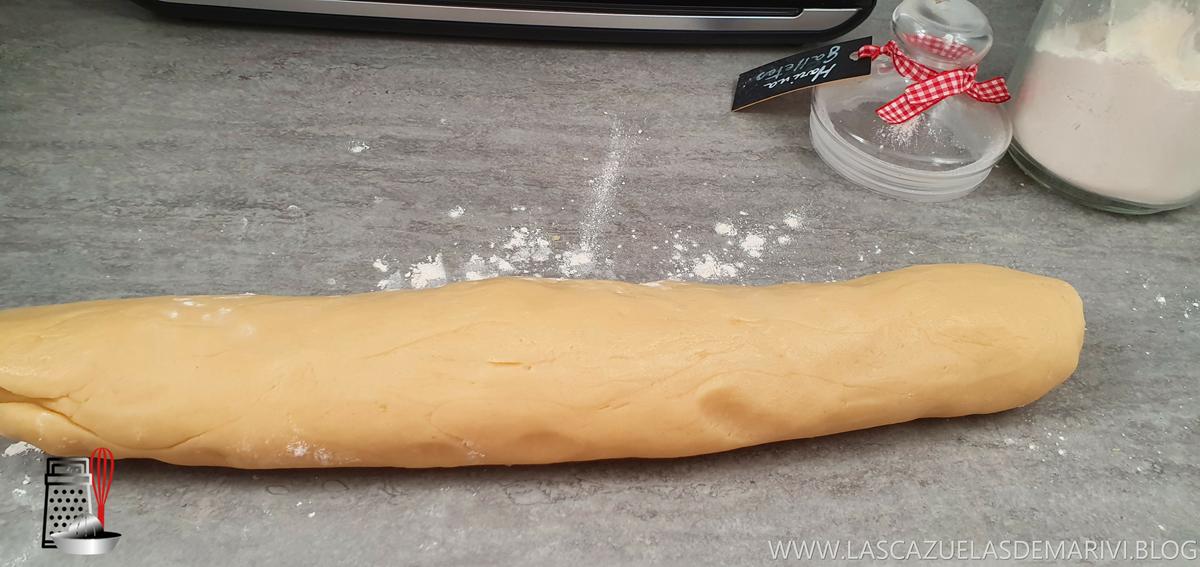 Ponemos la masa sobre un trozo de papel film, hacemos un rulo y lo llevamos a la nevera.