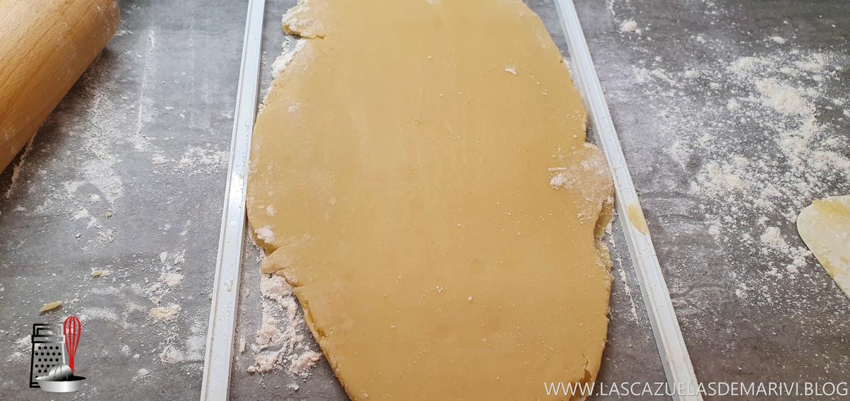 Saco un trozo de la masa de las galletas, pongo un poco más de harina en la mesa y en un rodillo. Con unas guías, extiendo las galletas, 1/2 cm de grosor.
