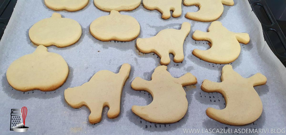 Con los cortapastas hago las diferentes formas y las voy poniendo en una bandeja para horno forrada de papel para horno.