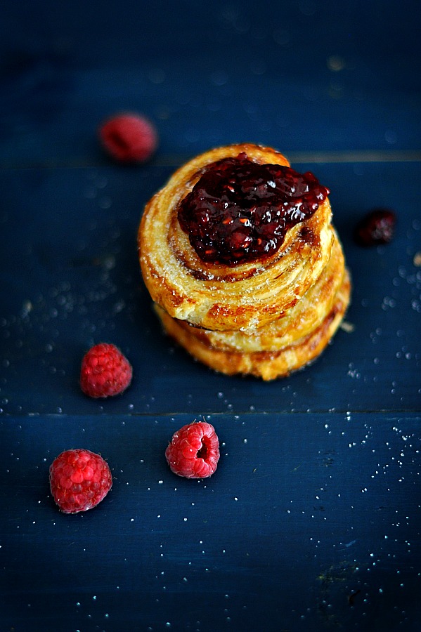- Extiende la mermelada de frambuesa sobre la masa de hojaldre. Si cuesta un poco extender la mermelada, póngala unos segundos en el microondas para que se suavice y sea más fácil para extender.
