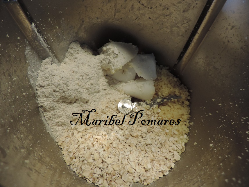 Añadimos la manteca, harina integral, copos de avena, agua y sal.