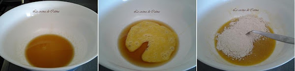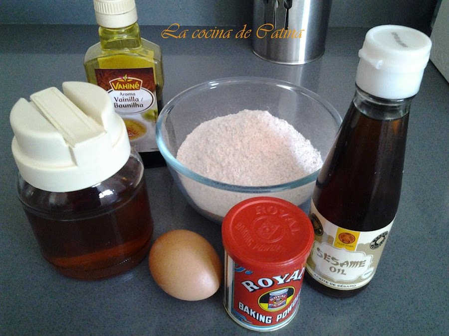 Mezclamos en un bol la miel con el aceite de sésamo, añadimos un huevo ligeramente batido con un tenedor y poco a poco, vamos incorporando la harina, la levadura y la vainilla en polvo (tamizadas juntas la levadura y la vainilla).