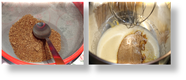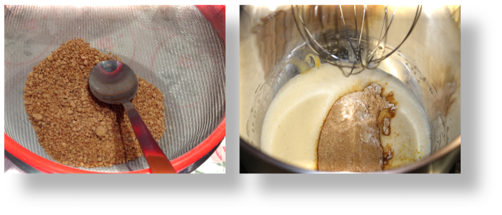 En un bol tamiza los siguientes ingredientes: harinas (una vez tamizadas, lo que te quede en el tamíz, añádelo a la harina filtrada), sal, bicarbonato y canela. Mezcla bien con una espátula de silicona. Reserva.