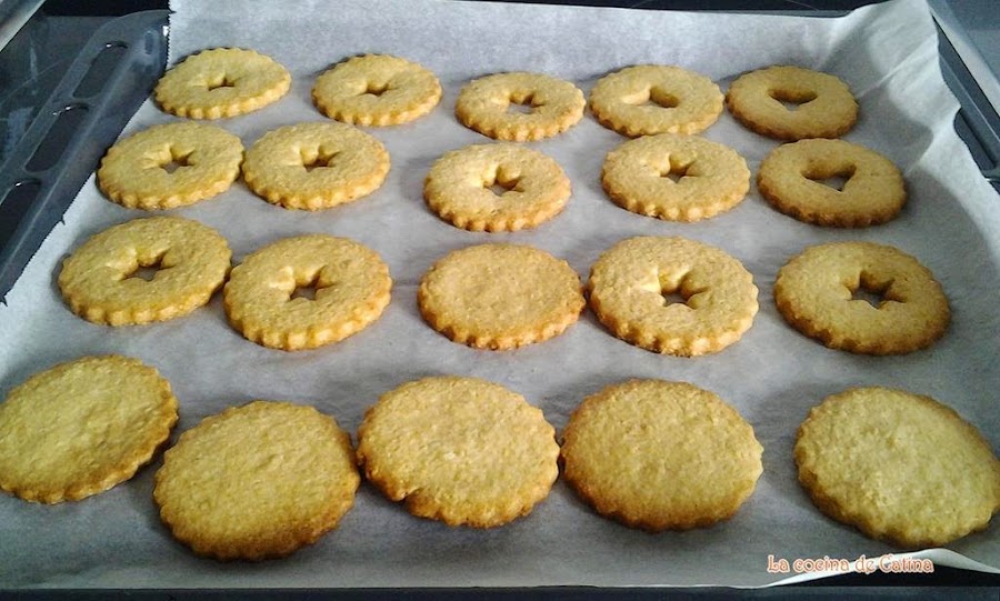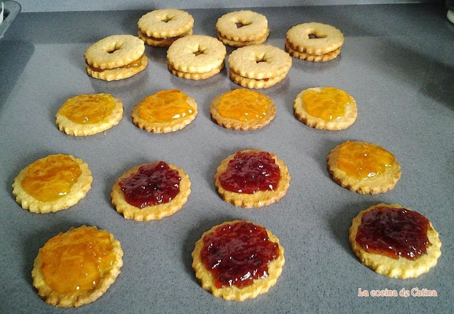 Una vez frías la galleta entera se cubre con mermelada y se coloca encima la galleta agujereada, decoramos con azúcar glas.