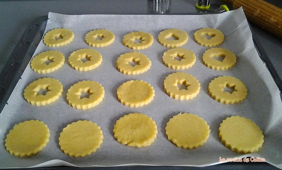 Cortar las galletas con un cortapastas con la forma deseada, unas enteras y otras con agugerito en el centro.