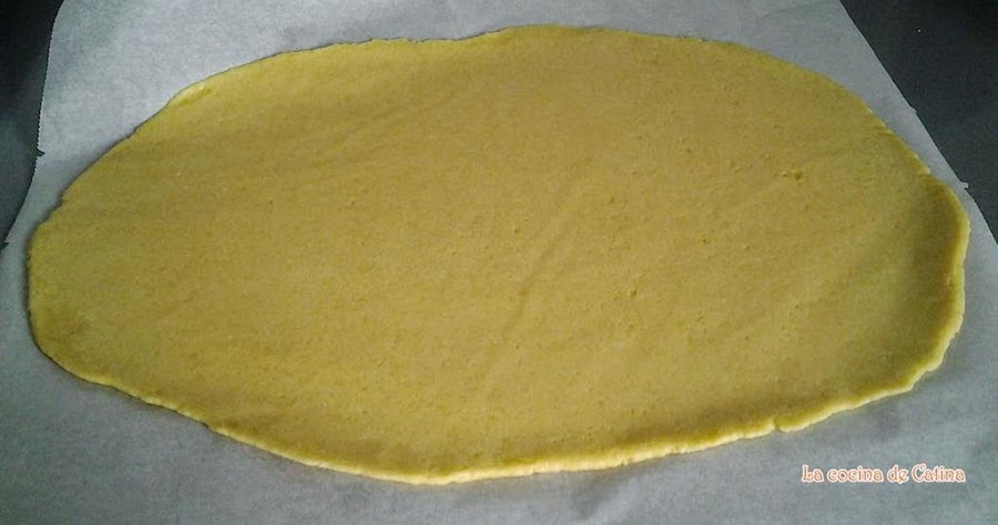 Colocamos la masa entre dos papeles de horno (papel sulfurizado), estiramos con el rodillo, dejándola de unos 5 milímetros aproximadamente de grosor y guardamos en el frigorífico durante una hora.