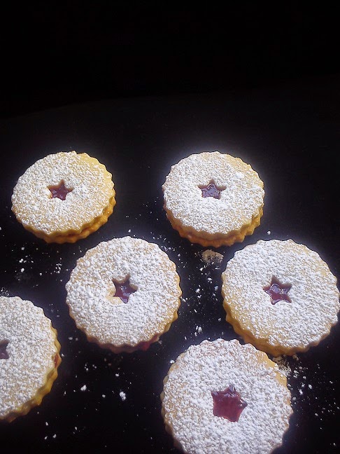 Cuando ya lleven un tiempo en el frigo, es hora de cortarlas, existen unos cortadores especiales para estas galletas, pero yo las hice con un cortador redondo y uno pequeñito en forma de estrella. Hay que hacer una galleta "entera" y otra con tapa, es algo obvio, pero por si acaso, yo aviso jejeje. Se ponen en la bandeja del horno, lo introducimos dentro de éste (precalentado a 170º) unos 15 minutos, vigilando porque se queman enseguida. Tened en cuenta que no se tuesten mucho, estas galletas son más bien blanquitas- Las dejamos enfriar en una rejilla y una vez frías, primero espolvoreamos con azúcar glass las tapas (es decir, las que están agujereadas), las rellenamos con la mermelada (se puede elegir el sabor que queramos, pero el blanco de las galletas con el rojo de la mermelada de fresa queda genial), y ya están listas para comer!!!
