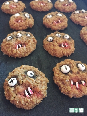 Estas galletas son como el dicho: "tanto sirven para un roto como para un descosido". Las preparé en los talleres de los Espais Joves de Septiembre como una merienda saludable, y ahora las he tuneado un poco para las meriendas de Halloween, en este caso las decoraciones son con fondant, un añadido "extra" para la ocasión. ¿Que os parecen?