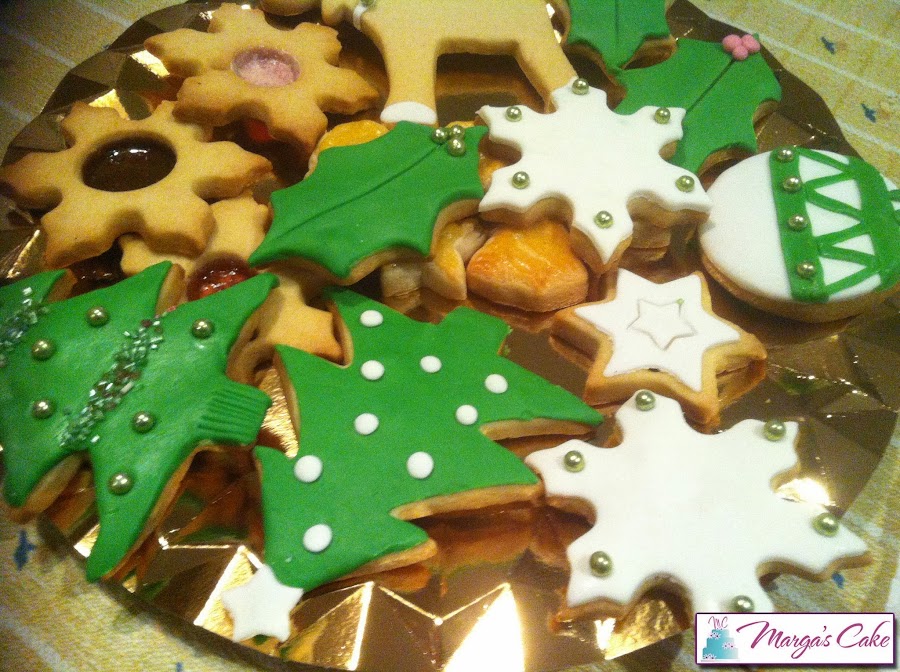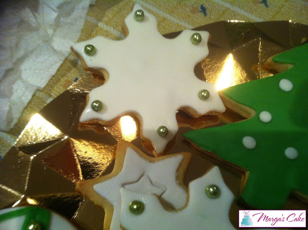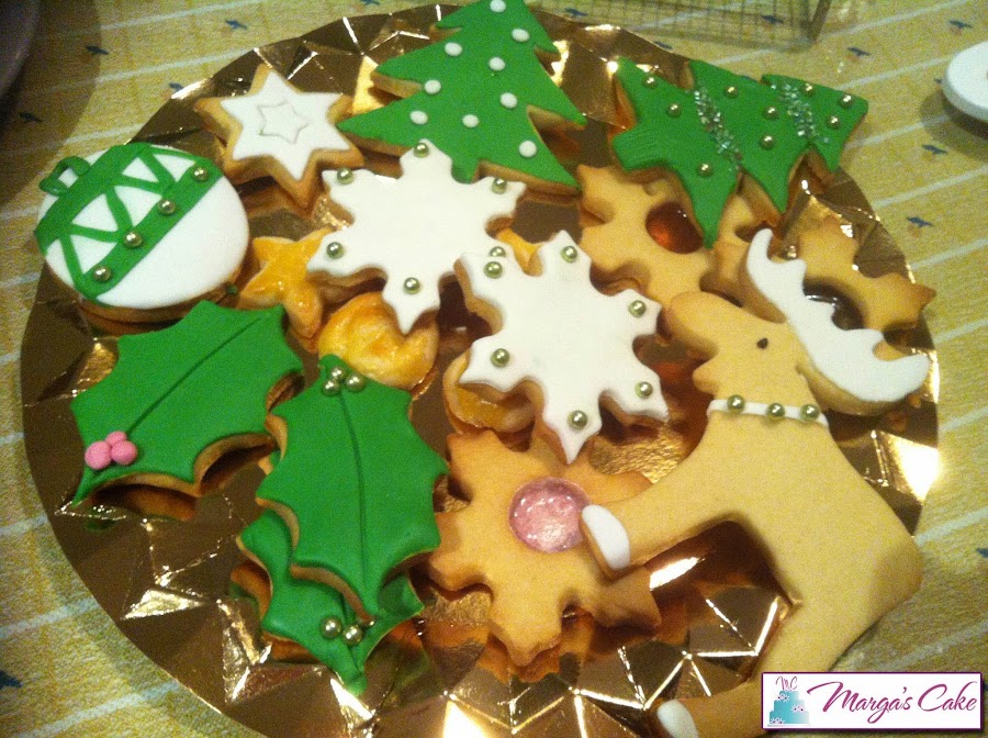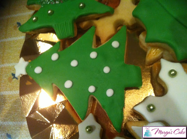 Fondant verde y blancoEsta última lleva el centro de la galleta con caramelo de café que lo conseguiremos añadiéndole a la galleta cuando la introduzcamos al horno un caramelo en el hueco de esta. La dejamos hornear y el caramelo se habrá derretido, el truco está en no levantar la galleta hasta que no esté totalmente fría y este será el resultado.