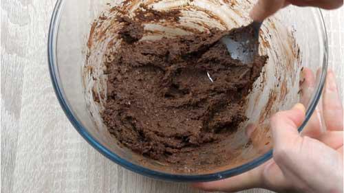 En primer lugar, en un recipiente echamos la harina de avena integral, el endulzante (en mi caso he usado azúcar de coco, pero puedes usar el que más te guste), el cacao puro en polvo, una pizca de sal, el aceite de coco y la leche o bebida vegetal.Todos estos ingredientes los mezclamos bien hasta obtener una masa oscura, homogénea y manejable, que no se pegue a las manos.