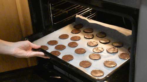 Precalentamos el horno a 180 grados y cuando esté caliente metemos las galletas, a mitad de altura, con calor por arriba y por abajo y horneamos durante unos 10-15 minutos. Esto dependerá de cada horno. Yo las tuve unos 15 minutos.Cuando se vean tostadas, las sacamos y dejamos enfriar sobre una rejilla mientras preparamos el relleno.