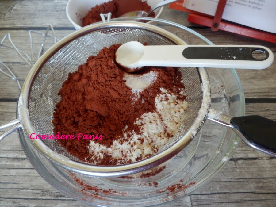Lo primero que debemos hacer es tamizar los ingredientes secos como son la harina, el cacao y el bicarbonato sódico.