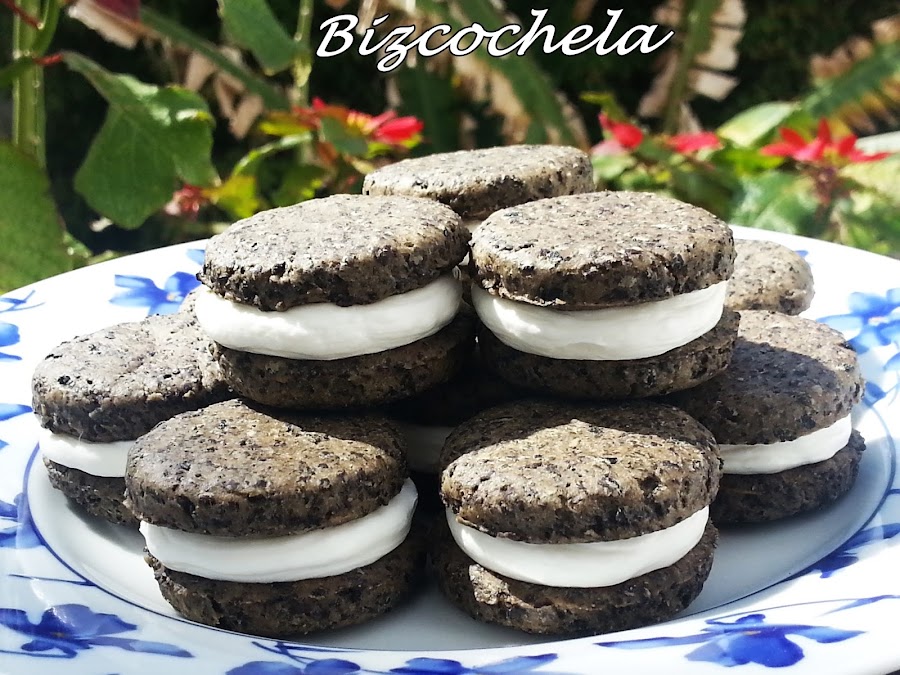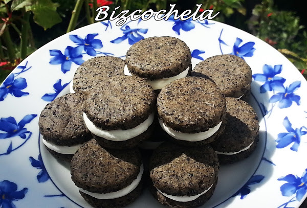 Dicho todo esto, me puse a buscar la receta por ahí, y he dado con ésta, y nos han encantado. Una recomendación, lo mejor es tomar las galletas abriéndolas y comerlas por mitades, que si no, al morderlas, se os sale el queso por los lados!!!!