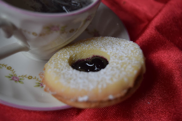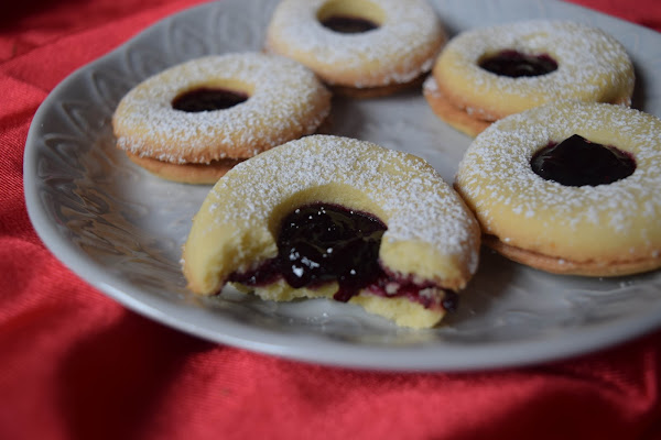 Una vez las galletas esten frías espolvoreamos las tapas con azúcar glas y rellenamos con la mermelada.