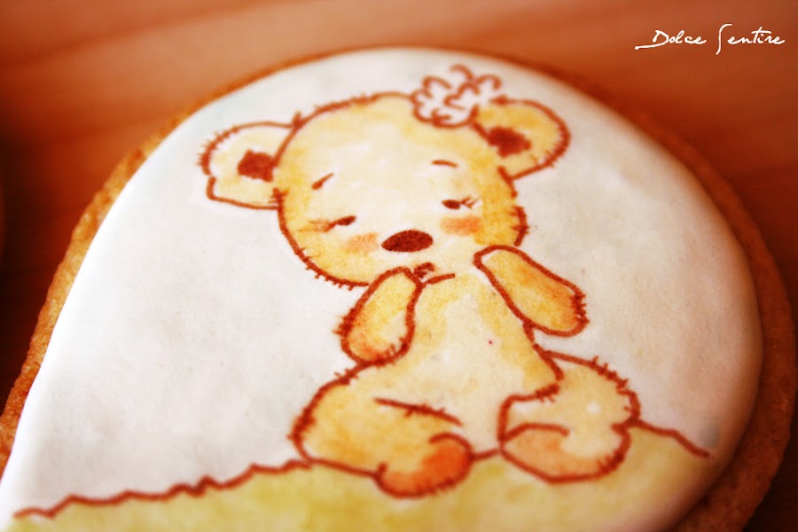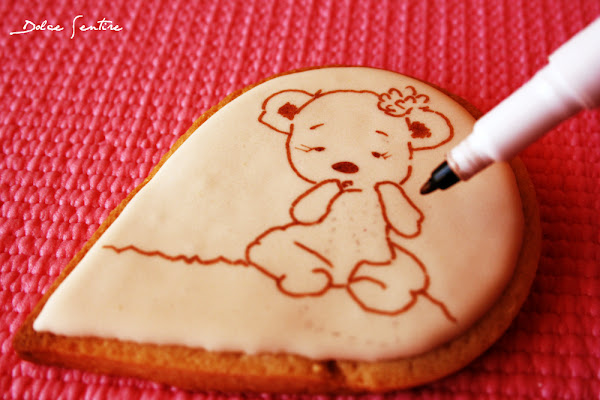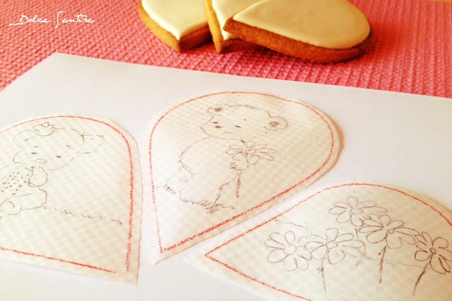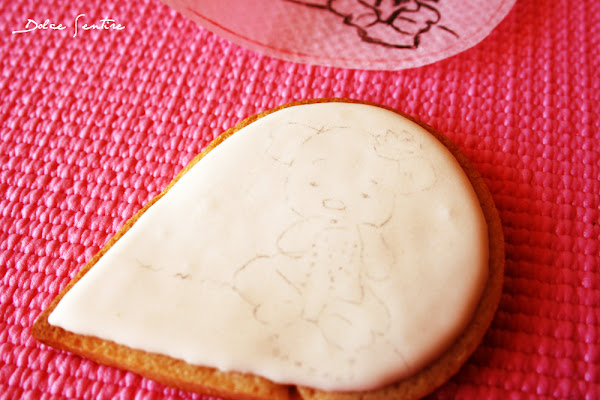 En este caso, debemos calcarla sobre la galleta cubierta de glasa y seca. No existe mayor complicación ya que es exactamente igual: calcamos el dibujo en papel de horno y lo pasamos a la galleta glaseada con un lápiz no tóxico.