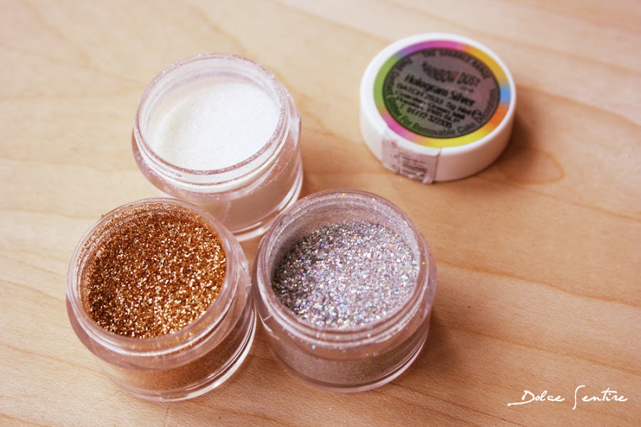 En su defecto, podemos usar los brillos de la misma marca de la categoría de comestibles (Edible Silk Range). Sin embargo, no tienen el mismo efecto glitter. Las he usado aquí, por ejemplo.