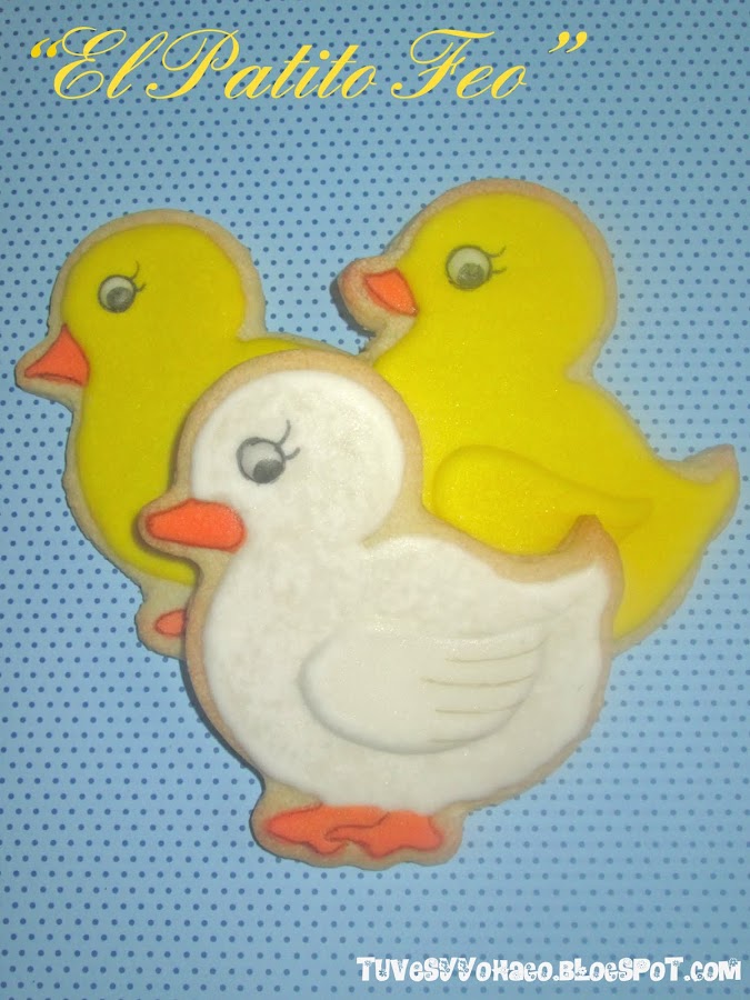 Patitos, patitos, patitos ... es lo que se repetía en mi mente desde que +Patricia Blanco Budia nos dijo el cuento. Y como los Reyes Magos me habían echado un cortador de un patito (parece que sabían que me iba a hacer falta), decidí preparar estas galletas del "Patito Feo".
