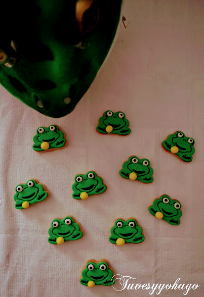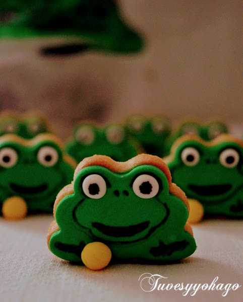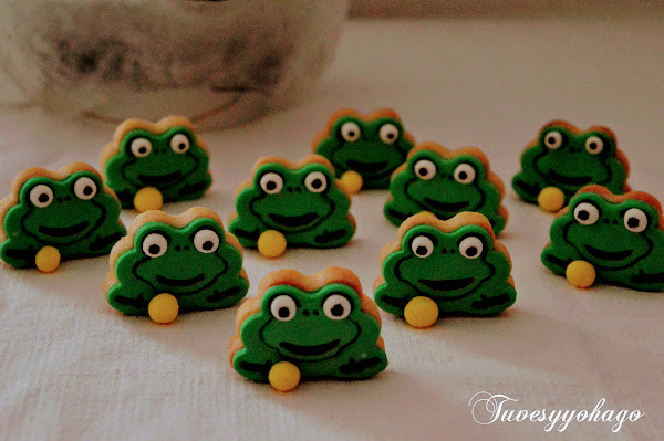 PREPARACIÓN:1. Estiramos la masa de galletas, cortamos las galletas con el cortador con forma de rana y las horneamos. Cuando estén horneadas, las dejamos enfriar antes de decorarlas.