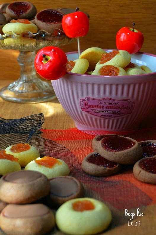 Pasado este tiempo, vamos pillando pequeñas porciones de masa a las que daremos forma de bolita y con un dedo le hacemos un hoyo que cubriremos posteriormente con las mermeladas elegidas.