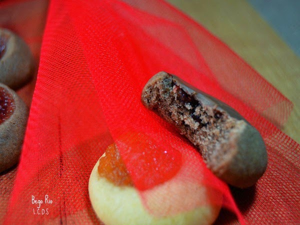 Una vez frias, a algunas galletas hechas con la masa de cacao y con relleno de mermelada de fresa, las cubrí sobre ésta, con cobertura de chocolate con leche, derretida al micro , una combinación que me resulta siempre fascinante .