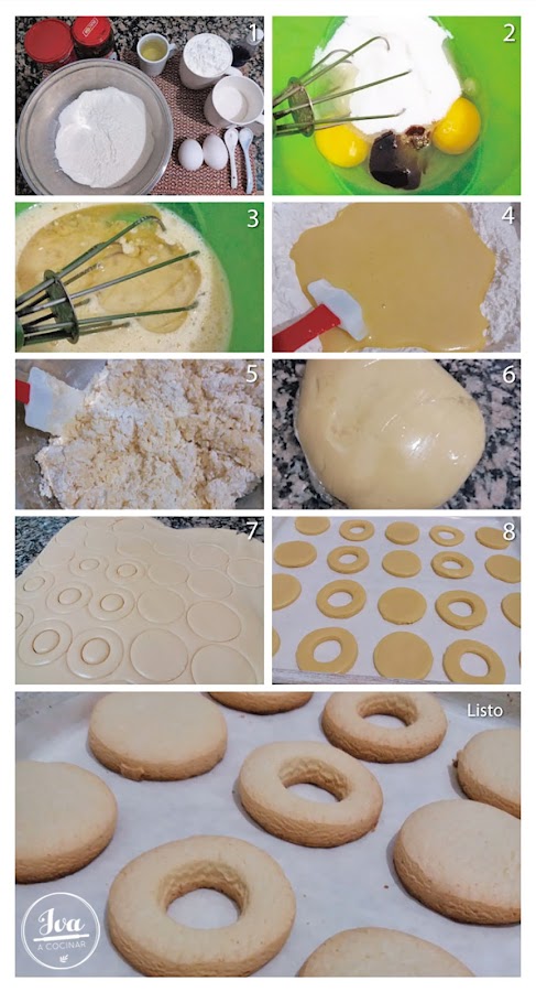 - Estirar la masa (con un poco de harina) y cortar círculos (del tamaño de 6 cm de diámetro aprox.) y a algunos realizarles el corte en el centro, que son las tapitas que van a ir arriba y debe verse el dulce del relleno.