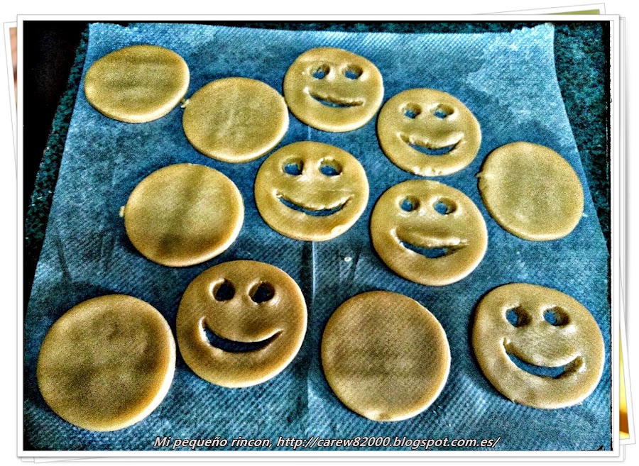 Ahora sacamos la masa del refrigerador y con ayuda del rodillo de amasar la extendemos dándole un grosor fino pero manejable, cortamos con la forma que más nos guste, yo he querido hacerlas tipo caritas Acid House, pero podéis dar la forma que mas os gusten, teniendo en cuenta que hay que las galletas deben ser pares.