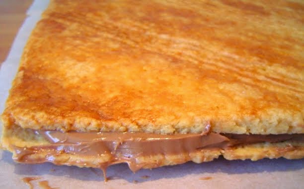 Se hornea las placas de masa por separado, y una vez a temperatura ambiente se las rellena