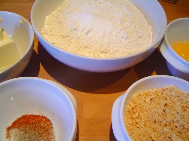 Troceamos las avellanas y añadimos la sal. el azúcar, la pimienta, el pimiento y el aceite.