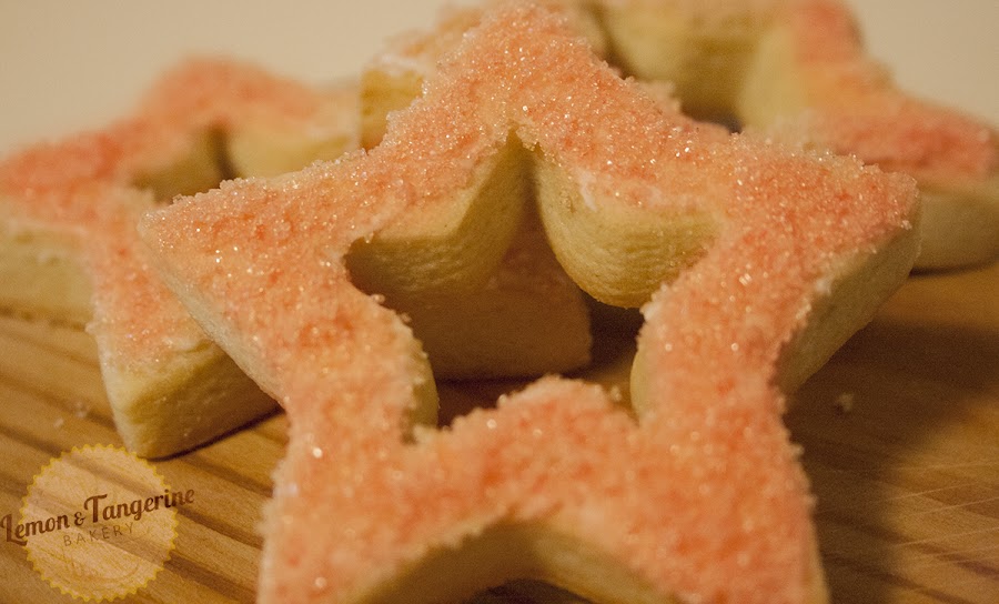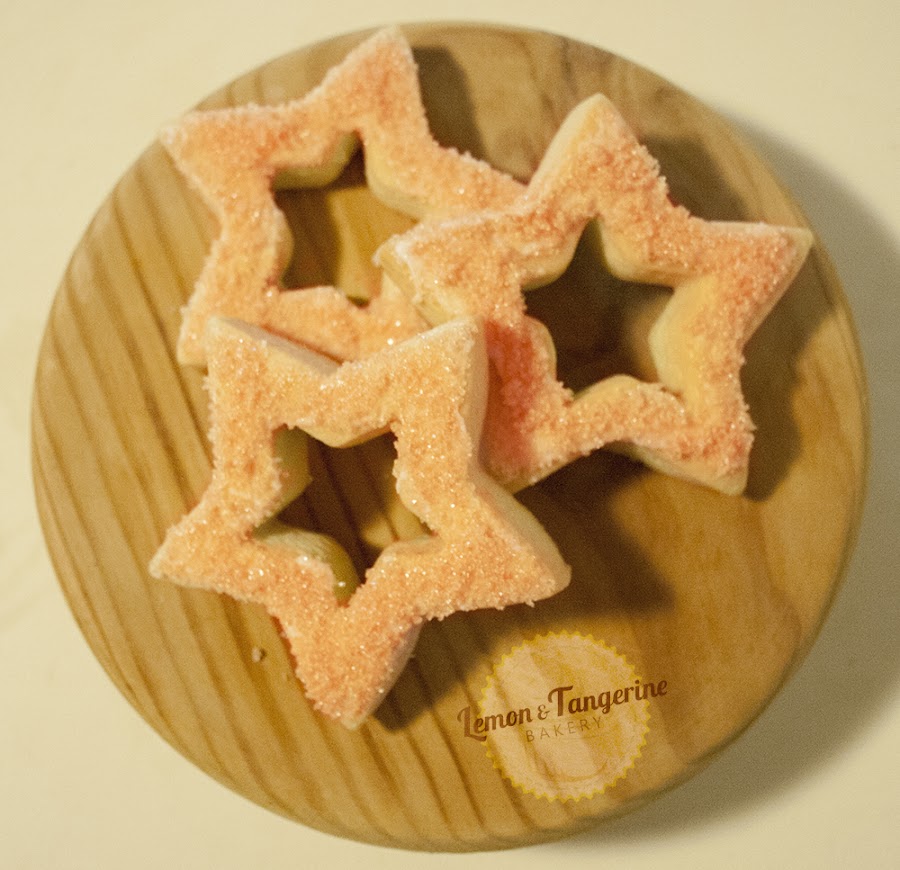 Las estrellas las hicimos con dos cortadores de estrella, obviamente. Por encima pusimos un poco de glasa y esparcimos azúcar que había pintado de color amarillo, naranja y rojo.