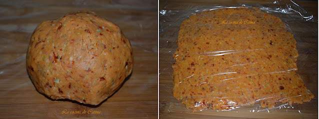 Ponemos la masa resultante entre dos trozos de film transparente y estiramos con el rodillo. Enfriamos durante media hora en el frigorífico.