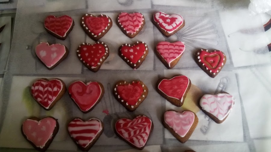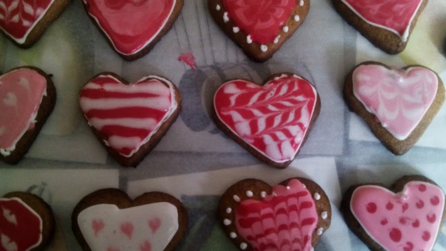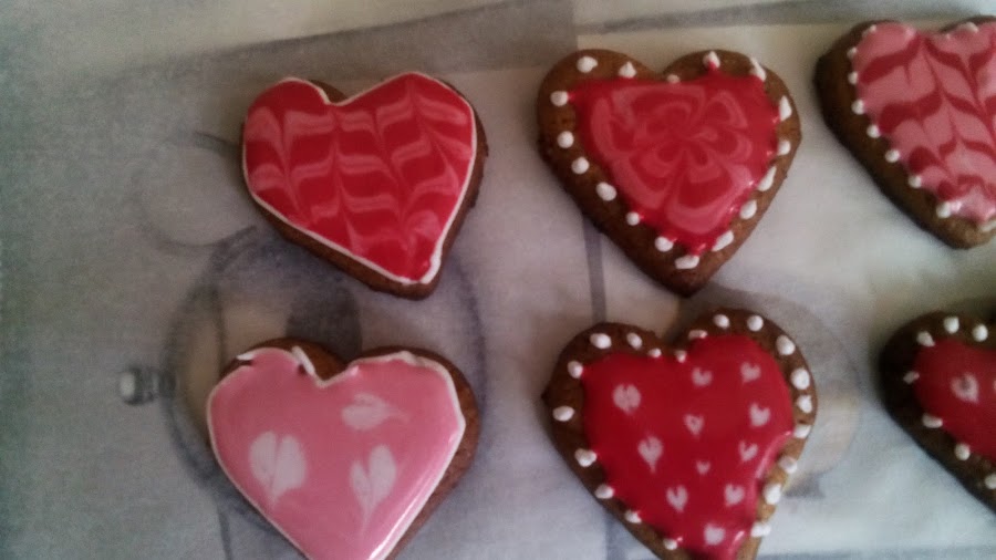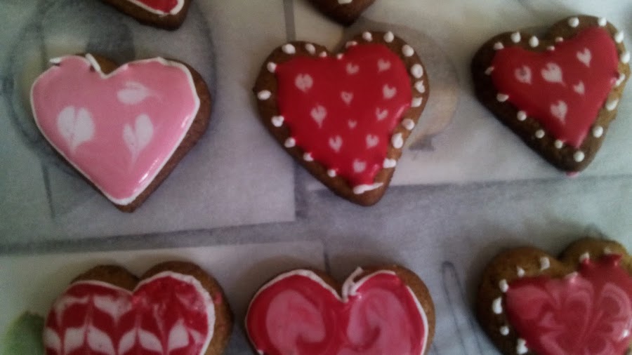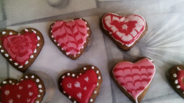 Dentro de muy pocos días llega san valentin y que mejor manera de decir te quiero con unas bonitas galletas decoradas con mucho amor. Los corazones son galletas de mantequilla decoradas con glasa de colores. Ingredientes de galletas: 125 gr de mantequilla, 250 gr de harina, 120 gr de azúcar, 1 huevo y ralladura de limón. Ingredientes de la glasa: 1 clara de huevo, 250 gr de azúcar glas y 2 cucharaditas de zumo de limón. Elaboración galletas: en un bol ponemos la harina y la mantequilla y restregamos hasta formar una arena, añadimos los demás ingredientes y formamos una masa que Guardaremos en la nevera envuelto en film transparente durante una hora. Pasado este tiempo estendemos la masa con el rodillo y cortamos con un corta pastas, hornear 10 min a 180°c. Elaboración de la glasa: batimos la clara a punto de nieve, cuando este bien montada ir añadiendo el azúcar glas poco a poco mientras vamos removiendo, cuando nos quede poco azúcar para incorporar añadimos el zumo de limón y seguir batiendo. Sabremos que esta listo cuando toquemos con el dedo y no se nos pegue. Para los bordes de las galletas usar esta glasa mas dura y para rellenar separar distintos boles de glasa añadir el colorante del color que queremos y añadir un poco de agua para que sea mas liquida. Decorar las galletas con distintos motivos.