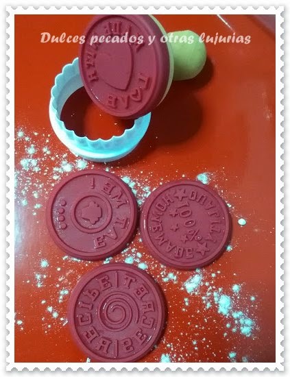 Siguiendo las instrucciones de Silvia formaremos bolitas de unos 40 grs. cada una (salen como unas 30) y las aplastaremos utilizando el molde de sello hasta que empiece a sobresalir la masa por los bordes.
