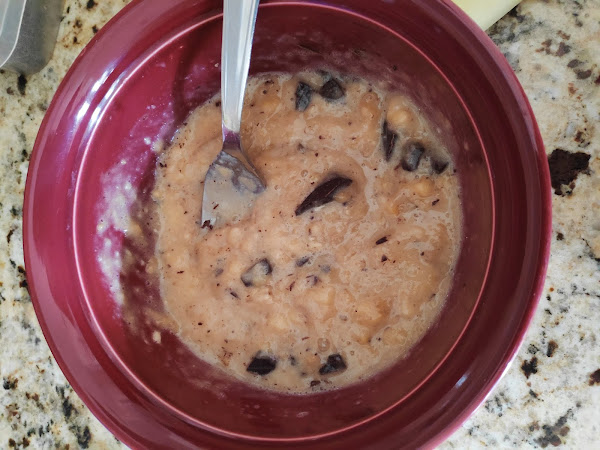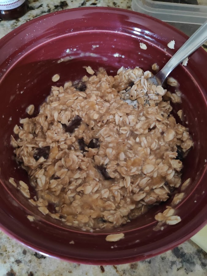 Agrega los copos de avena y las onzas de chocolate ya picaditas. Para picar el chocolate, te recomiendo que lo tengas previamente en la nevera, ya que con el calor del verano se te puede deshacer al intentar cortarlo y, si está frío, los trocitos de chocolate serán más bonitos.