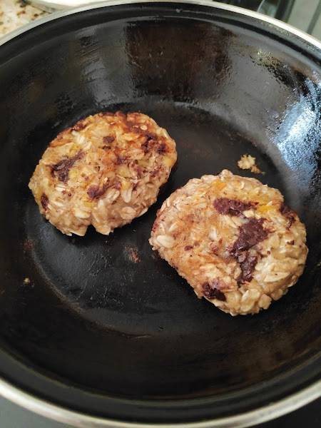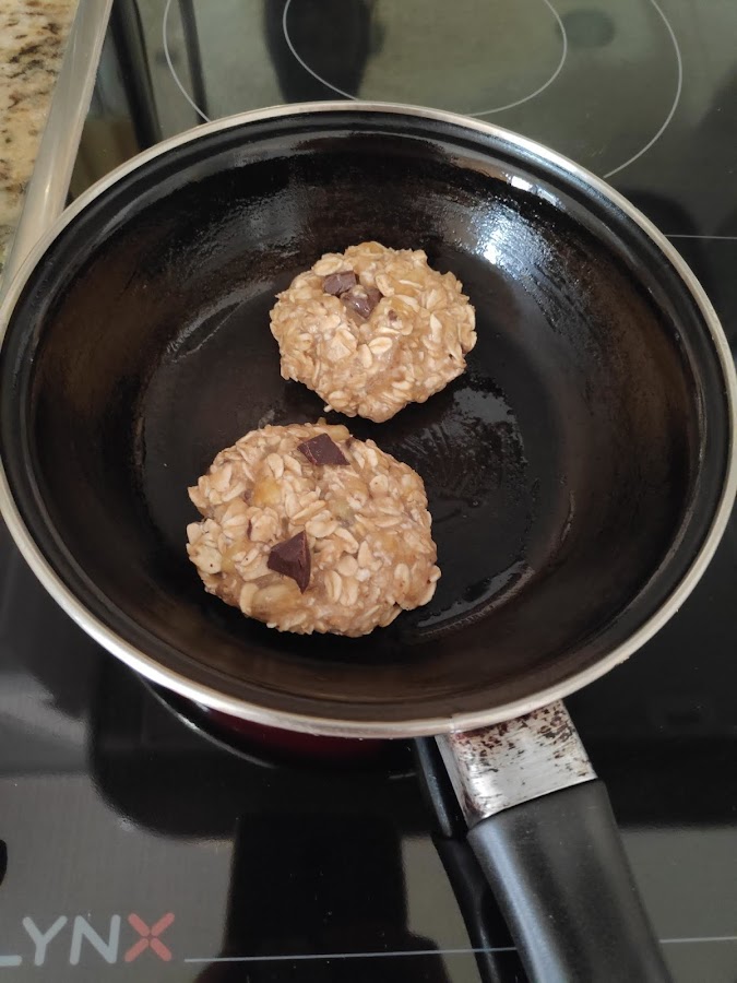 Pinta una sartén antiadherente con aceite de coco o de oliva virgen extra y, cuando esté caliente, añade las galletas ya con la forma que les hayas dado con las manos.