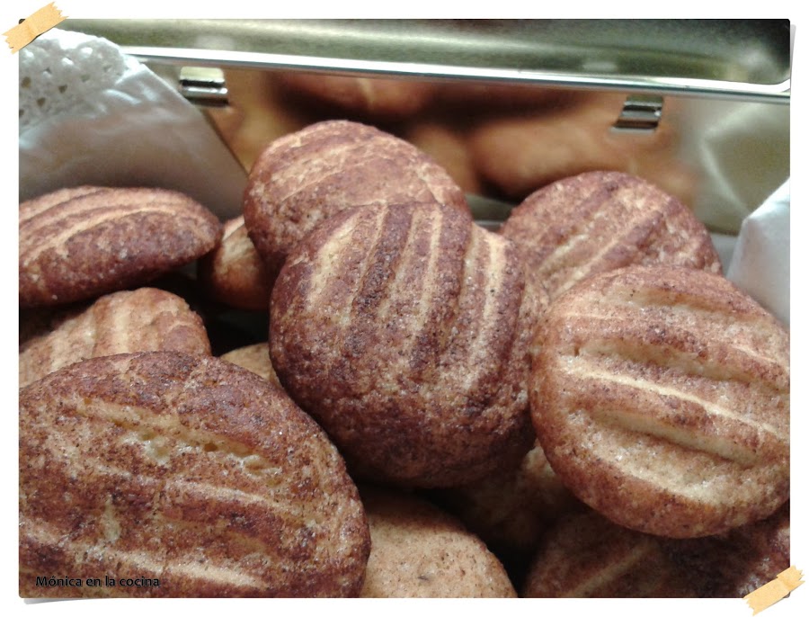 Con la masa hacer bolitas un poquito más grandes del tamaño de una avellana y las rebozamos con la mezcla de canela y de azúcar. Se colocan sobre el papel de hornear que habremos colocado en la bandeja de horno. Como crecen bastante, procurar dejar un buen hueco entre ellas.